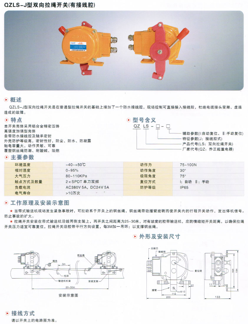當(dāng)前位置:主頁(yè) > 產(chǎn)品中心 > 輸送帶保護(hù)系列 > QZLS-J型雙向拉繩開(kāi)關(guān)(有接線腔)